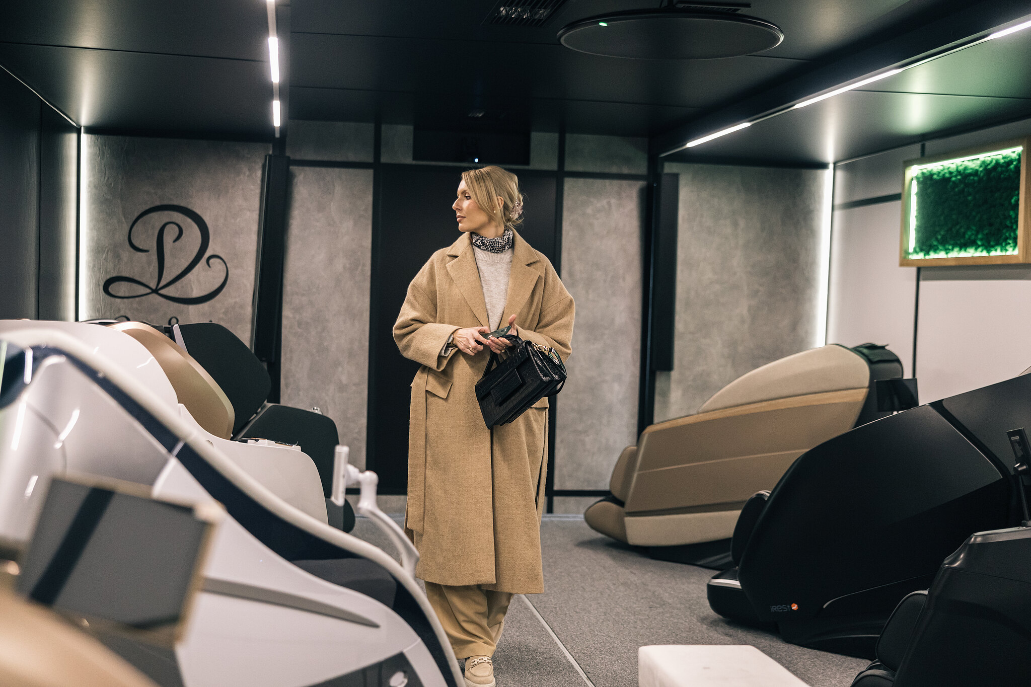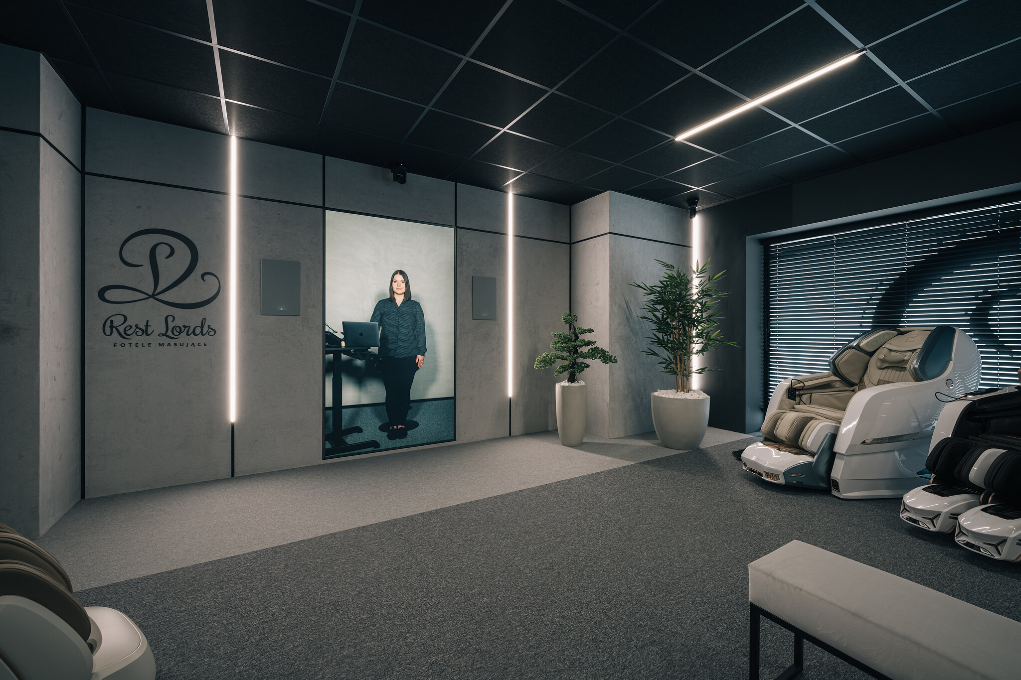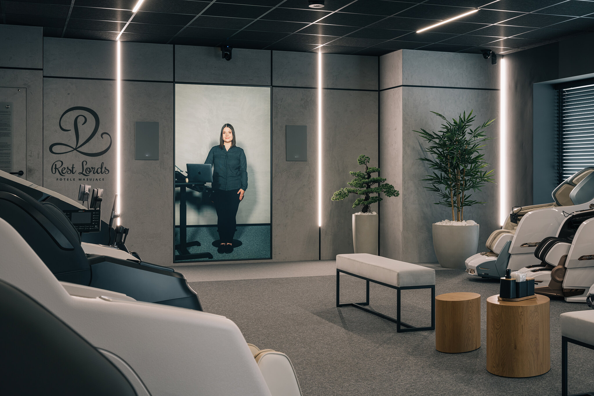 R-ShowRoom is the first project of its kind in the world, where customers can test massage chairs in a technologically advanced space with a remote advisor who physically is in another city. The showroom is owned by Rest Lords, the originator of the concept and the coordinator of the implementation. In close cooperation with Brill AV Media, which was responsible for the design, implementation and integration of the AV solutions, and a number of contractors providing electrical solutions, remote access, interior design or finishing work, a remarkable 100 m2 space with 12 luxury massage chairs was arranged. Inside the showroom, special attention has been paid to the audio-visual parameters to make every customer feel incredibly comfortable. Particular attention has been paid to appropriate acoustic adaptation and the highest quality of video and sound has been ensured.