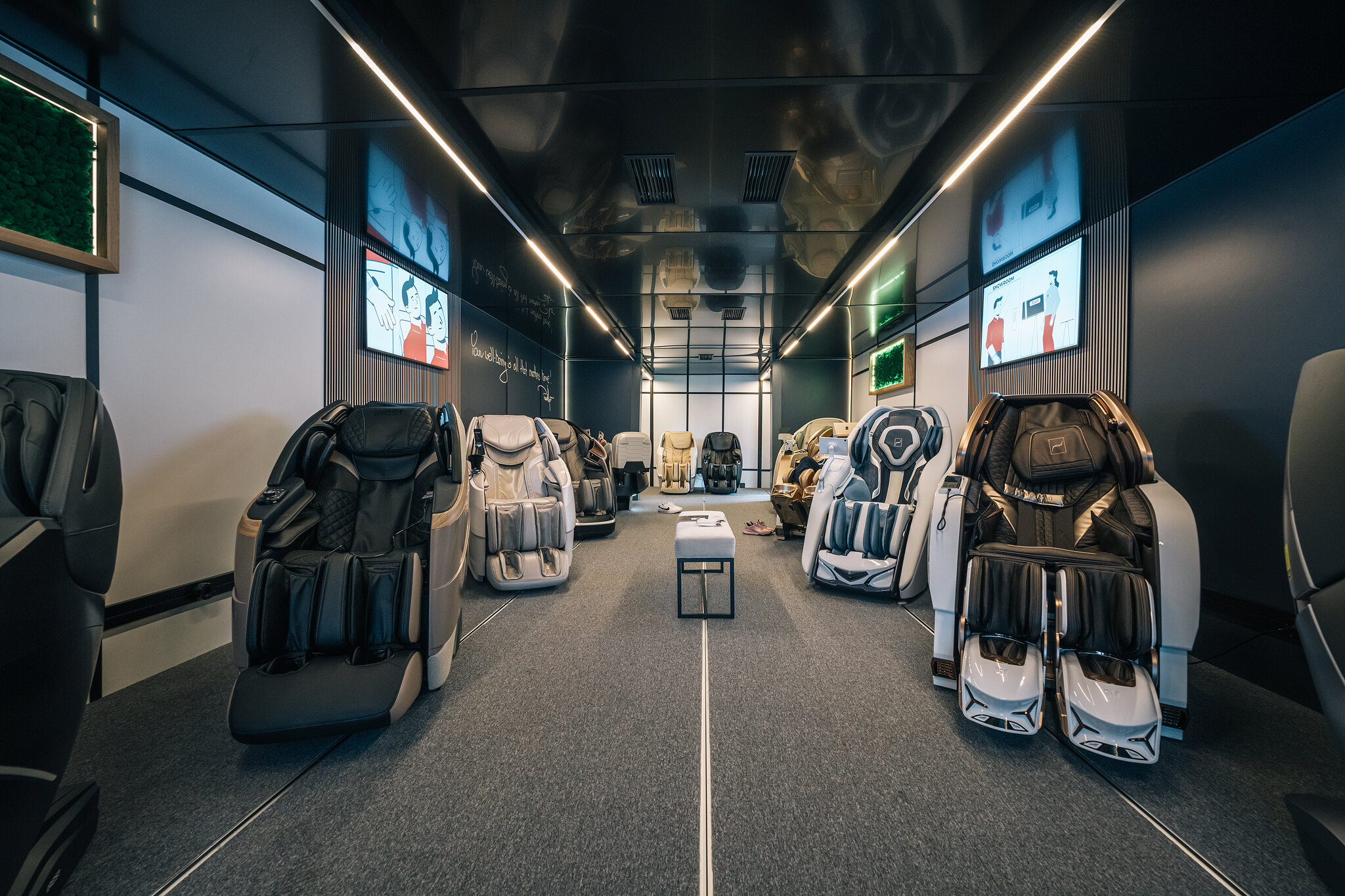 The peculiar and unfamiliar features of the chairs, in order to be fully understood, frequently require prior testing, the experience of a massage on one’s own skin, something that a website cannot convey. The shipping, assembly or return is not as easy as with shoes or clothing. The dimensions also prevent the chairs from occupying entire aisles in retail markets. This is where the idea of semi-autonomous showrooms originated – anywhere in the world (just like e-commerce), aimed at the already interested customers, not random, with reservation system, remote assistance, semi-autonomous.